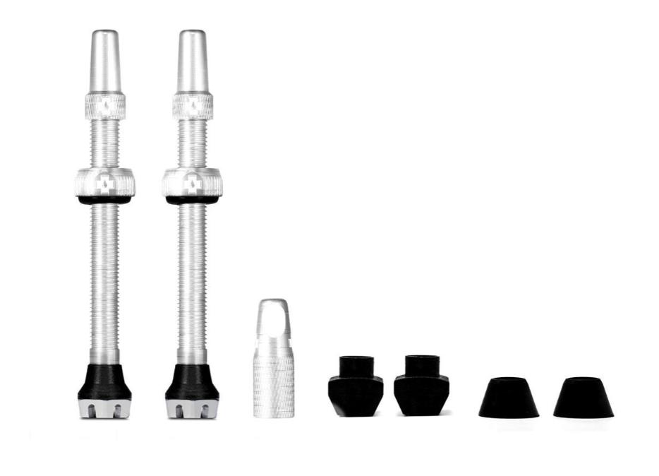 Innhold: 2 x slangeløse ventiler, 2 x smale runde baser, 2 x brede runde baser og 2 x firkantede baser for tilpasning til ulike felgprofiler. Ekstra ventilhette i aluminium med integrert verktøy for fjerning av ventilkjerne.