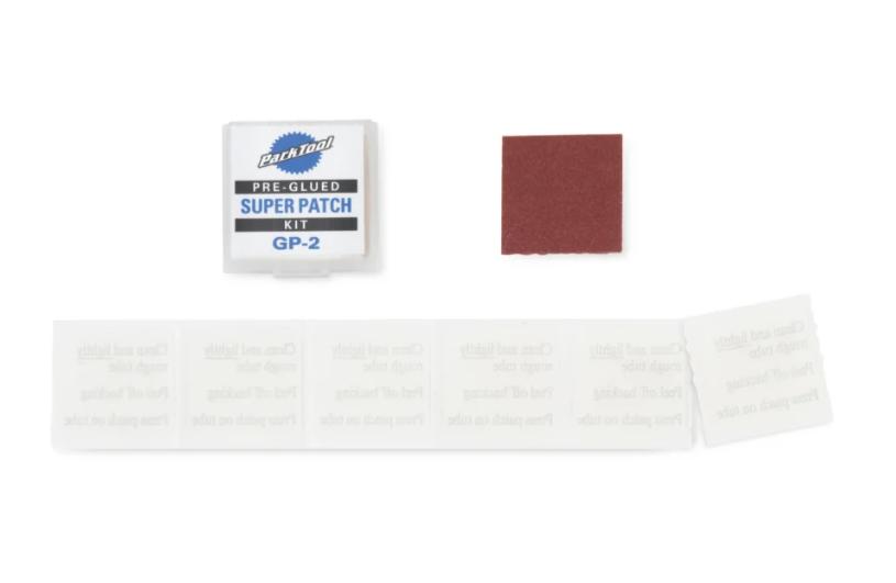 Park Tool har utviklet GP-2 i samarbeid med 3M for å produsere disse selvklebende lappene som kan strekkes og bøyes til å passe slanger. Ingen grisete lim eller klumpete emballasje. Ru til slangen med det medfølgende sandpapiret, rengjør, sett på lapp og slangen er klar til bruk.