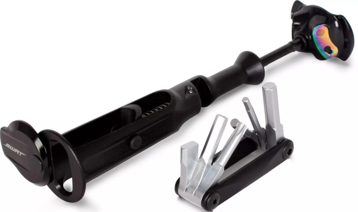 Før du havner i trøbbel, er det viktig å planlegge hvordan du skal komme deg ut av det. Vel, se ikke lenger enn vårt SWAT™ Conceal Carry MTB-verktøy. Det gjemmer et nød-multiverktøy og kjedebryter inne i styrerøret på en dempegaffel for enkel transport og umiddelbar tilgang. På verktøyet finner du et bredt utvalg av unbrakonøkler og en Torx-nøkkel, slik at du kan komme deg ut av enhver utfordring langs stien.