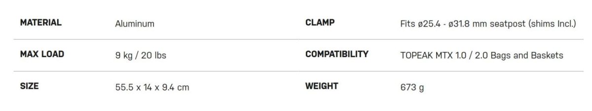 Den nydesignede forlengede og utvidede versjonen av MTX BEAMRACK er mer egnet for 29″ terrengsykler og gravel-sykler. Den har en MTX QuiCkTrack®-kompatibel paneldesign, med en lastekapasitet på 9 kg. Mål: 51.7x12x8.9 cm. Vekt: 673 g.